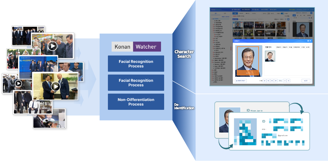 Through Konan Watcher’s deep learning-based facial recognition and clustering technologies, the Presidential Archives automatically tagged crucial and secondary individuals appearing in videos and automatically clustered unlearned individuals. Through this process, the agency has been able to significantly reduce the time and costs related to reorganizing individual-related images and videos collected by the thousands over the course of a day through the president’s surroundings.